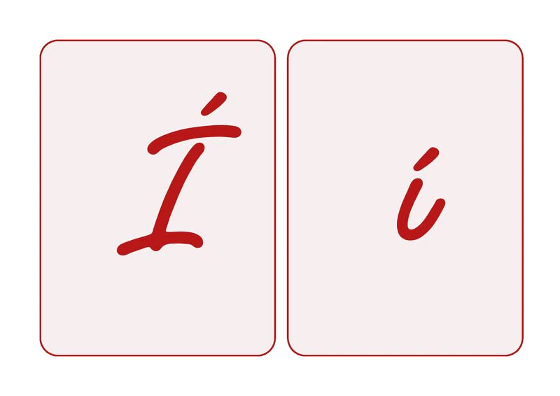 Este conjunto de moldes apresenta a letra I com acento agudo em letra cursiva, nas versões maiúscula e minúscula: Í/í. Os cartões exibem cada forma com traçado cursivo nítido e bem delineado, em vermelho escuro sobre fundo claro com moldura vermelha, proporcionando alto contraste visual e fácil leitura por parte dos alunos.