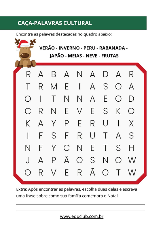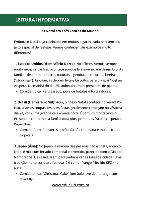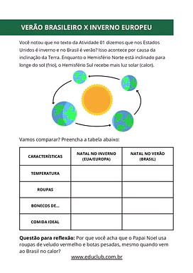 Utilize este material para iniciar discussões sobre diversidade cultural e geografia. As atividades podem ser realizadas individualmente ou em grupos, incentivando a pesquisa e a troca de informações entre os alunos. A questão sobre o Papai Noel pode gerar um debate interessante sobre a adaptação de tradições.