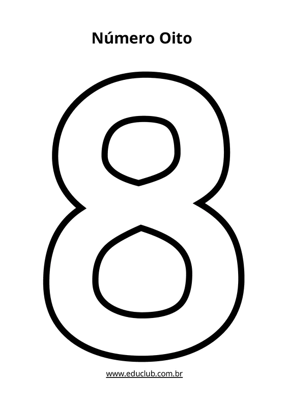 Neste material, você encontrará uma folha com o numeral oito em formato vazado, pronto para ser impresso. Este design permite que as crianças preencham o número com diversas técnicas, como pintura, colagem ou pontilhamento.