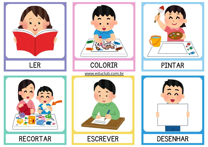 O que eu faço na escola pode ser utilizado em atividades de roda de conversa para discutir a rotina escolar, incentivando as crianças a descreverem o que fazem. Pode-se propor que os alunos pintem e recortem as imagens, criando um mural ou um pequeno livro sobre suas atividades na escola. É uma excelente ferramenta para iniciar o ano letivo ou para reforçar a organização da sala de aula.