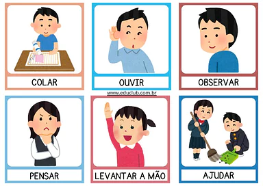Neste material, você encontrará uma série de ilustrações claras e palavras-chave que representam ações como 'LER', 'COLORIR', 'PINTAR', 'RECORTAR', 'ESCREVER', 'DESENHAR', 'COLAR', 'OUVIR', 'OBSERVAR', 'PENSAR', 'LEVANTAR A MÃO' e 'AJUDAR'. As atividades propostas incluem colorir, pintar e recortar, tornando o aprendizado mais dinâmico.