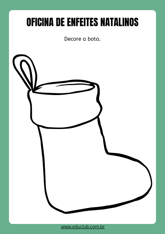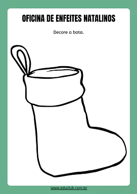 Quatro páginas com moldes de enfeites natalinos clássicos: uma guirlanda, uma bota, uma bola de Natal e uma luva. Estes desenhos servem como base para a colagem e decoração com diversos materiais sensoriais.