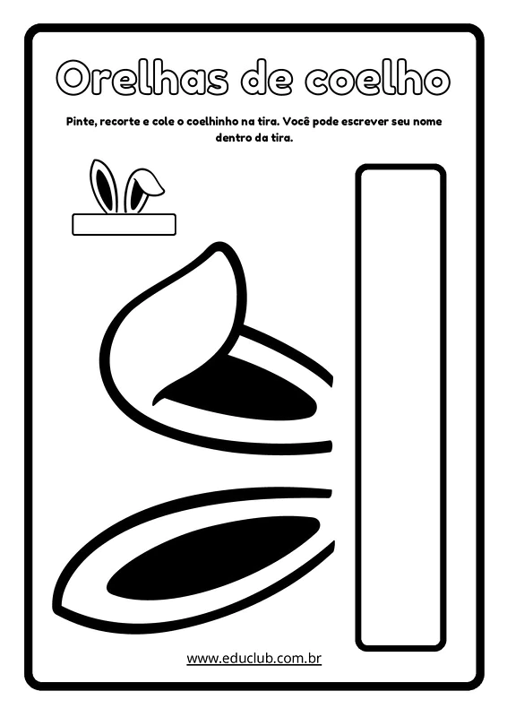 Neste material, você encontrará um molde de orelhas de coelho pronto para imprimir. O arquivo inclui instruções claras para colorir, recortar e montar as orelhas em uma tira, permitindo até mesmo que a criança personalize com seu nome.