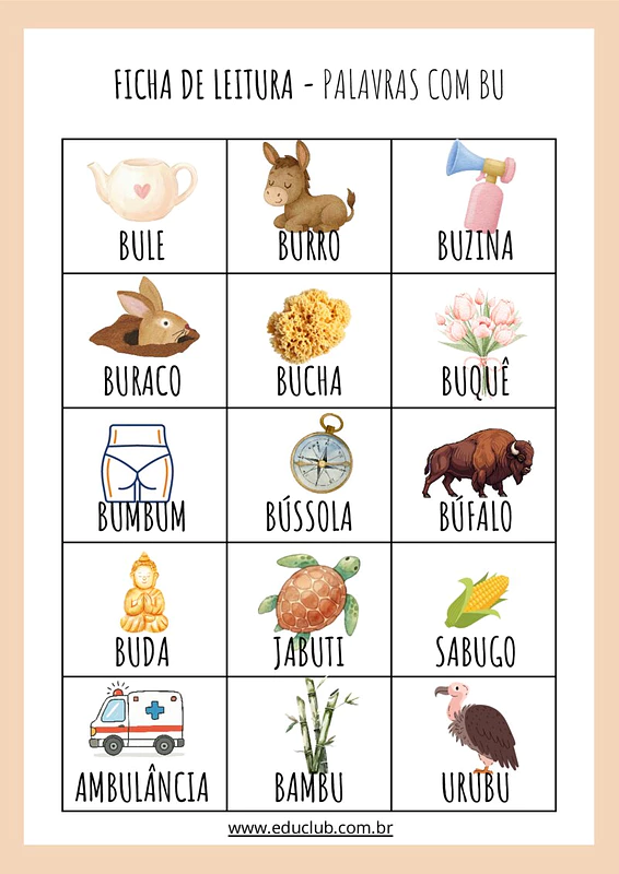 A ficha de leitura das palavras com BU é um recurso didático essencial para auxiliar no processo de alfabetização, focando na identificação e leitura de palavras que contêm a sílaba 'BU'. Este material foi cuidadosamente elaborado para desenvolver a consciência fonológica e a fluência leitora de forma prática e engajadora.