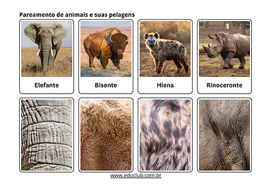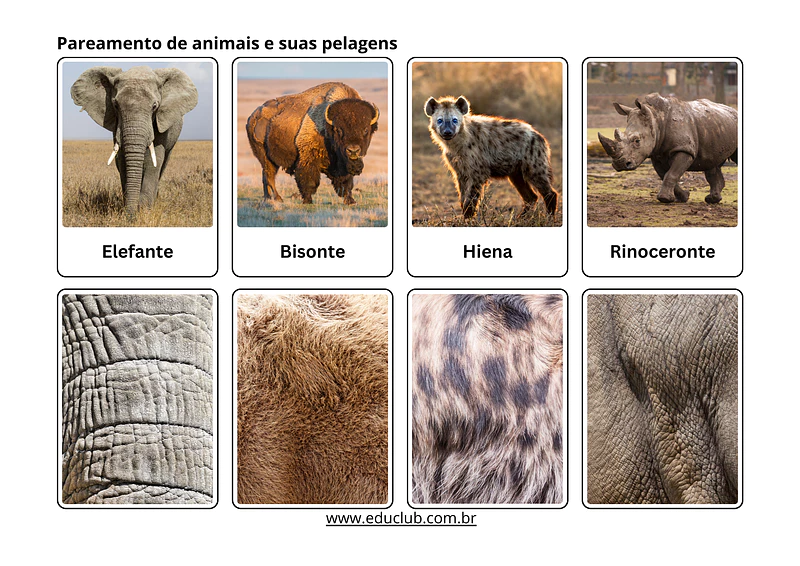 - Estrutura da atividade: Em cada folha, quatro animais são apresentados na parte superior, com seus nomes escritos abaixo. Na parte inferior, há quatro quadrados, cada um exibindo o padrão da pele ou pelo de um dos animais.