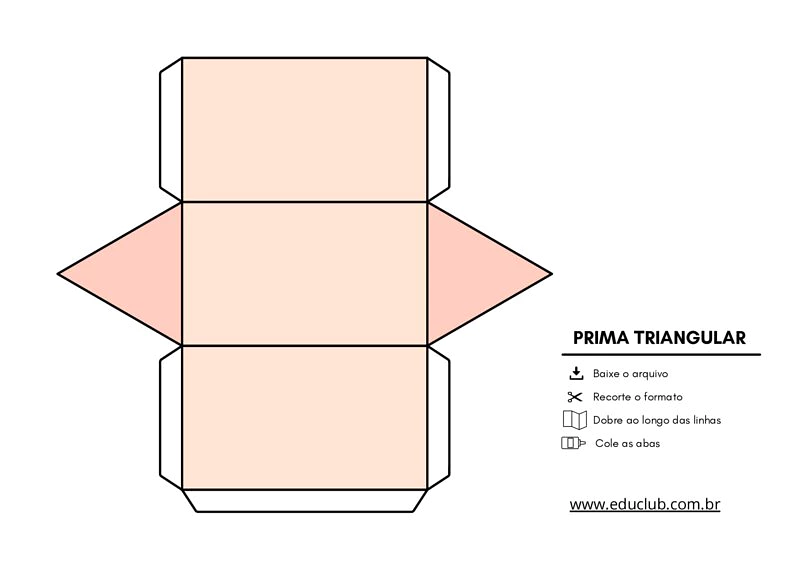 Neste material, você encontrará um molde pronto para impressão do prisma de base triangular. O arquivo inclui instruções claras para recortar, dobrar e colar, facilitando a montagem do prisma pelos próprios alunos.