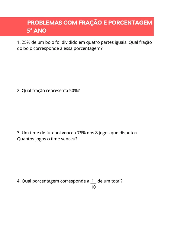 Explore o universo da matemática com o material Problemas com fração e porcentagem para 5º ano com gabarito, uma ferramenta didática essencial para consolidar o aprendizado de conceitos fundamentais. Este recurso foi cuidadosamente elaborado para desafiar os alunos e aprimorar suas habilidades de resolução de problemas, tornando o estudo de frações e porcentagens mais acessível e interessante.
