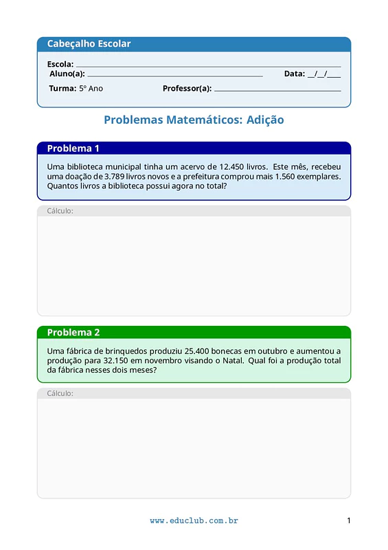 Explore e aprimore as habilidades matemáticas dos alunos do 5º Ano com o material Problemas de adição para 5 Ano do Ensino Fundamental. Esta atividade foi cuidadosamente elaborada para desafiar os estudantes a aplicar seus conhecimentos de adição em contextos do cotidiano, tornando o aprendizado mais significativo e engajador.