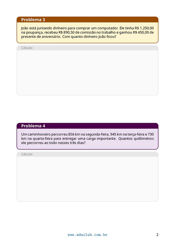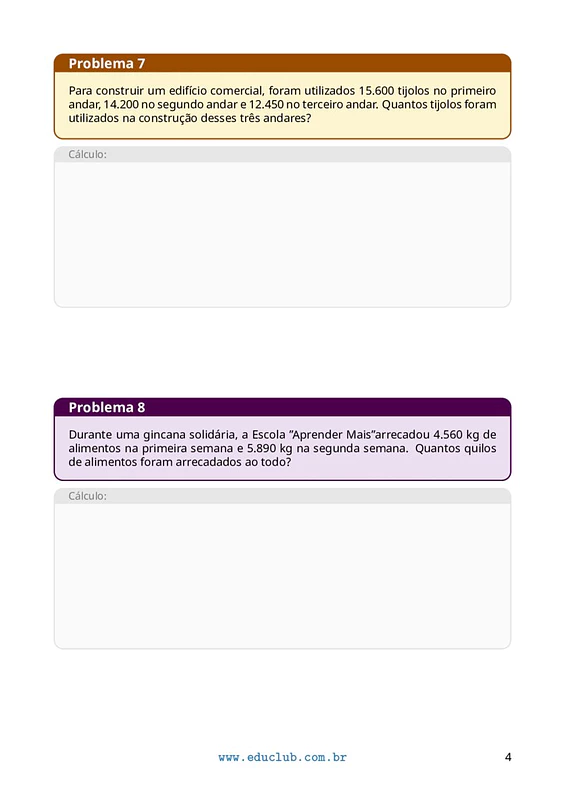 As atividades podem ser trabalhadas a modo individual, em duplas ou pequenos grupos, incentivando a discussão e a troca de estratégias de resolução. Sugere-se que os alunos leiam atentamente cada problema, identifiquem os dados relevantes e escolham a operação adequada para chegar à solução. Pode ser usado como reforço, avaliação ou tarefa de casa.