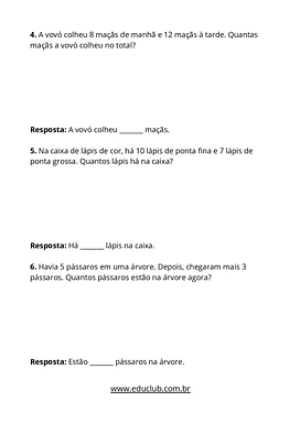 Explore o universo da matemática de forma lúdica e eficaz com os Probleminhas de adição e subtração com resultados até 20. Este material foi cuidadosamente elaborado para desenvolver o raciocínio lógico e as habilidades de cálculo dos alunos, tornando o aprendizado divertido e significativo.