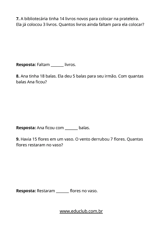 Neste material, você encontrará 12 problemas de adição e subtração, cuidadosamente formulados com contextos do cotidiano infantil. Cada problema apresenta um espaço para a resposta, incentivando a prática e a fixação dos conceitos de forma interativa.