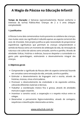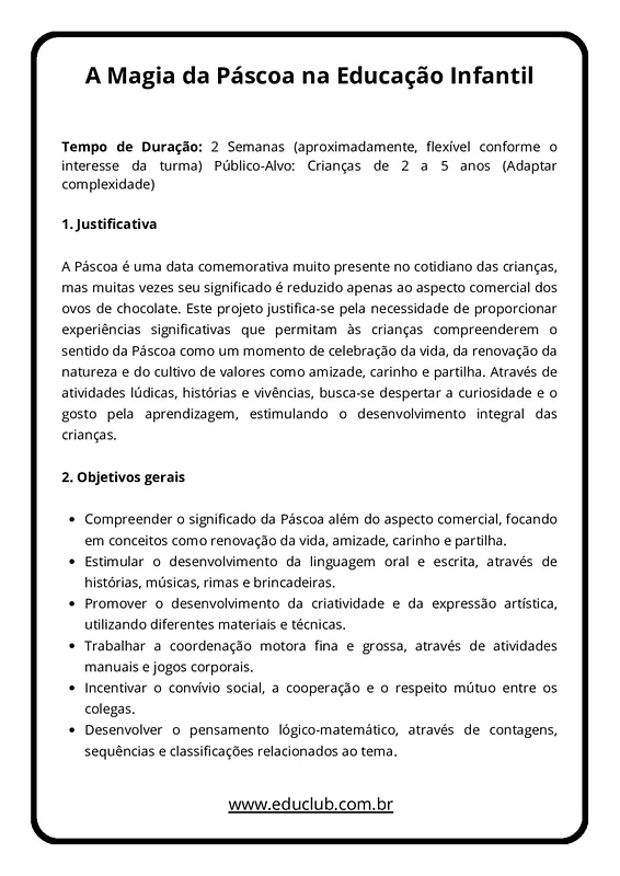 O projeto propõe uma abordagem que vai além do aspecto comercial, focando no significado da Páscoa como um momento de renovação, partilha e união. Através de atividades que envolvem música, culinária, artes e contação de histórias, as crianças são convidadas a explorar os símbolos pascais e a importância de sentimentos como o amor e a amizade. É um recurso ideal para criar memórias afetivas enquanto se desenvolvem competências fundamentais.