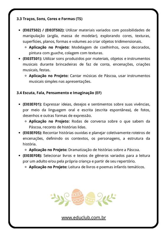 - Roda de Conversa: Inicie o projeto perguntando o que as crianças sabem sobre a Páscoa e apresente os símbolos (ovo, coelho, trigo) de forma tátil e visual.