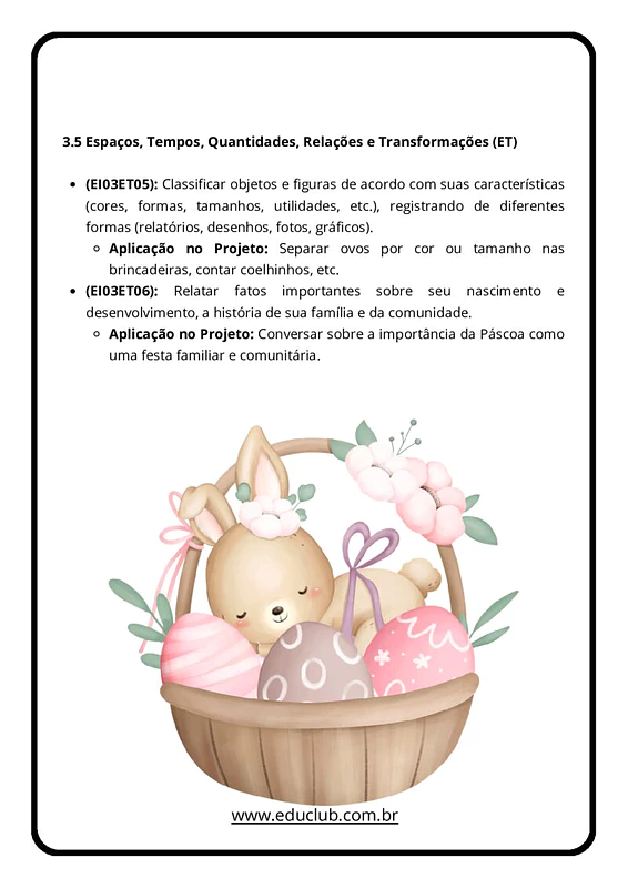 - Culminância: Organize um lanche coletivo ou uma caça ao tesouro (ovos) para celebrar as descobertas feitas durante a semana.