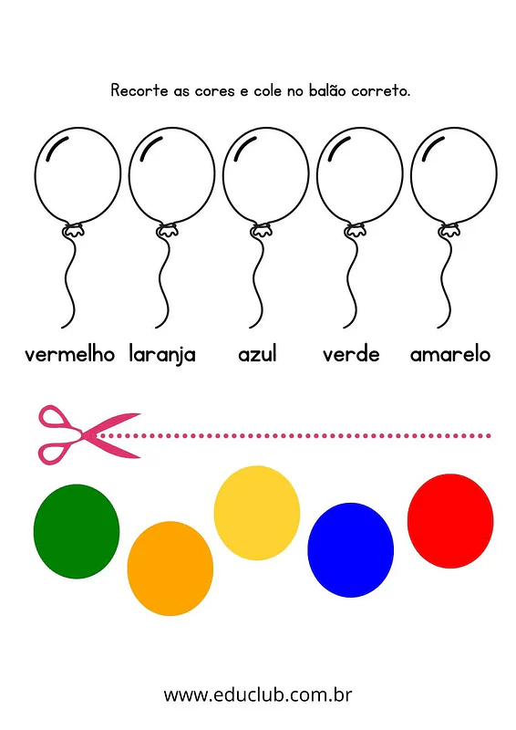 Atividade de recortar os círculos coloridos e colar no balão correspondente. Cada balão apresenta um nome de cor (vermelho, laranja, azul, verde e amarelo). É um bom exercício de relacionar o nome à sua cor correta.