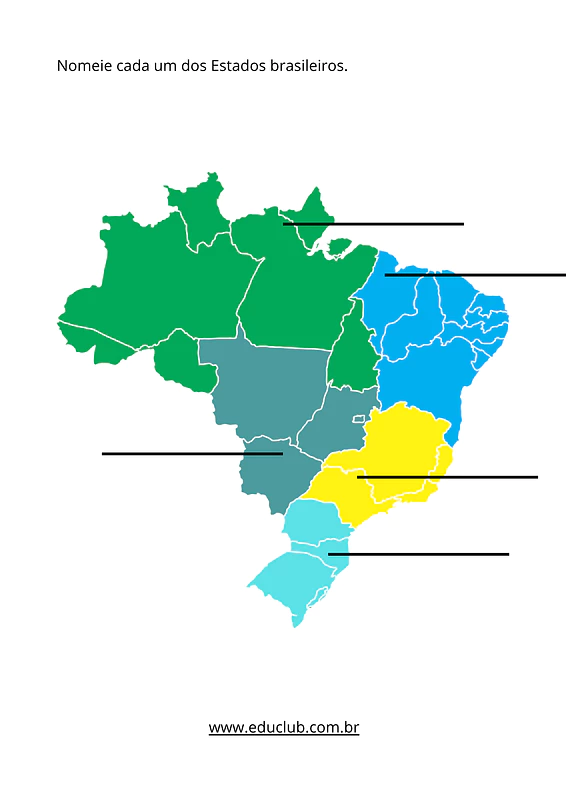 3. Mapa do Brasil para nomear: Um desafio extra com o mapa completo do Brasil para a criança praticar a nomeação de todos os estados brasileiros.