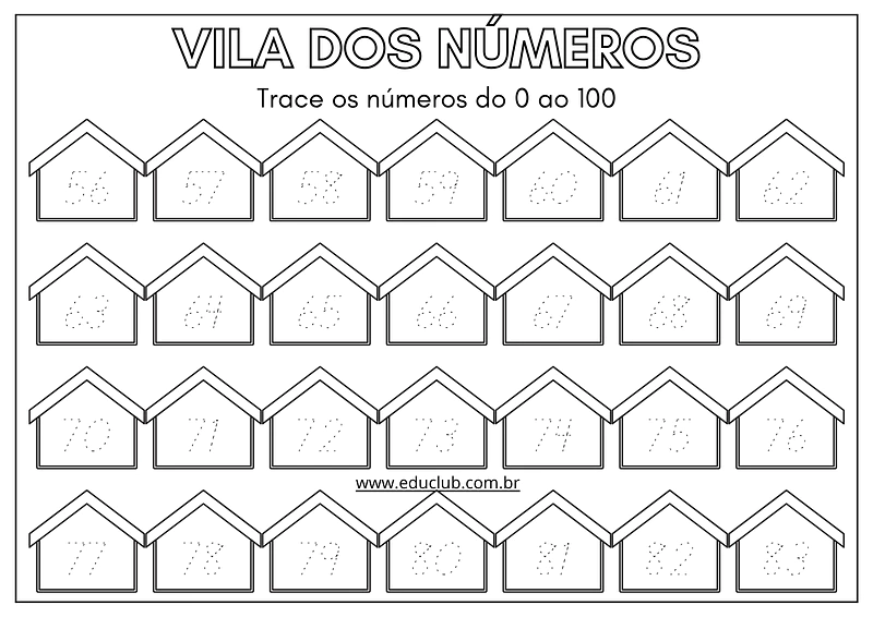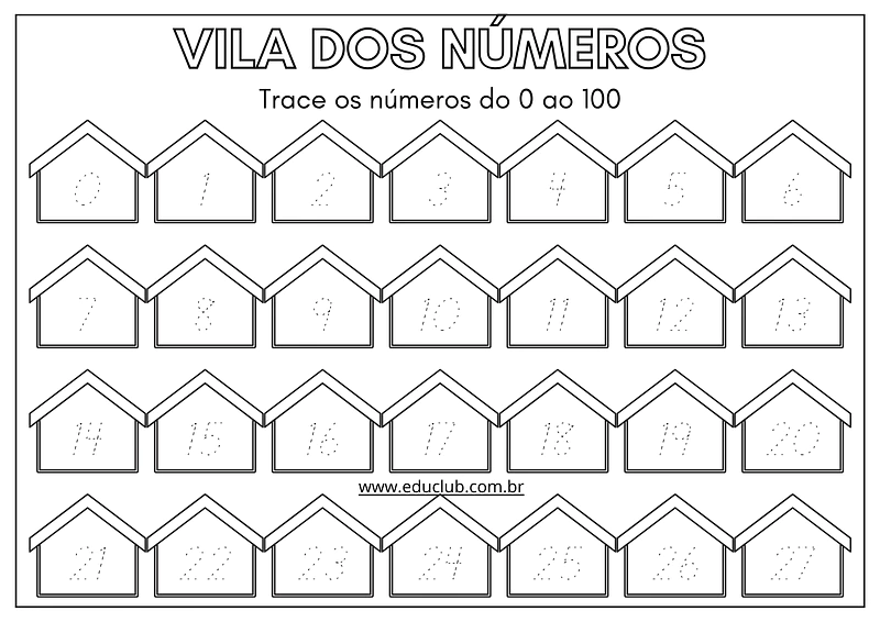 - Atividade de traçado completa: A atividade apresenta todos os números de 0 a 100 em formato pontilhado. As crianças são convidadas a traçar cada um deles, seguindo a ordem correta. Ao completar cada número, é como se estivessem construindo uma casa na "Vila dos Números", o que torna o processo mais lúdico e engajador.