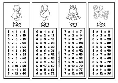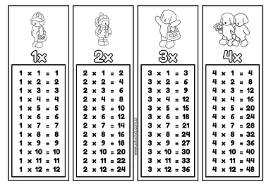 - Tabelas de multiplicação de 1 a 12: O material contém todas as tabuadas, desde a do 1 até a do 12. Cada uma é apresentada em um bloco individual, com uma fonte divertida e um título no estilo que lembra os produtos Bobbie Goods.