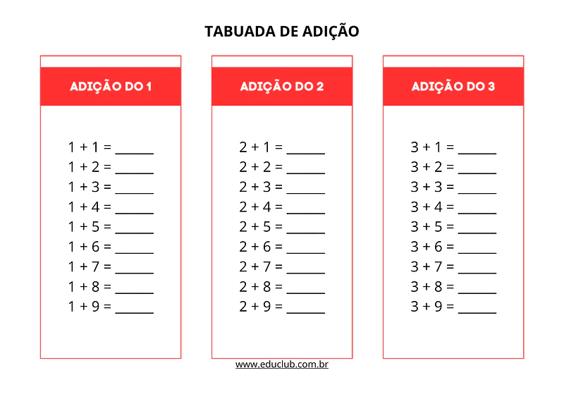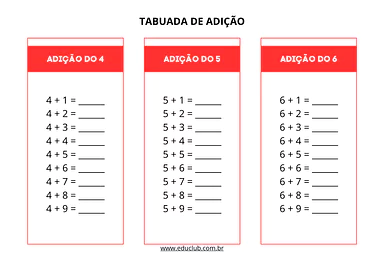 Entregue a folha de atividade para o aluno. Comece pela tabuada do 1 e avance progressivamente. A criança deve resolver cada operação e preencher o espaço em branco com o resultado. Ela pode utilizar os materiais concretos para auxiliar no cálculo, se ainda precisar. O objetivo é que, com a prática, ela passe a resolver as somas mentalmente.