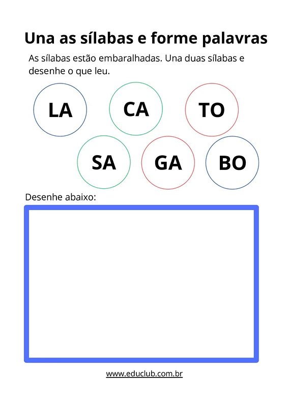 Neste material, você encontrará sílabas embaralhadas que devem ser unidas para formar palavras. Há também um espaço dedicado para que a criança desenhe o objeto ou conceito que a palavra formada representa, tornando a aprendizagem mais interativa e visual.